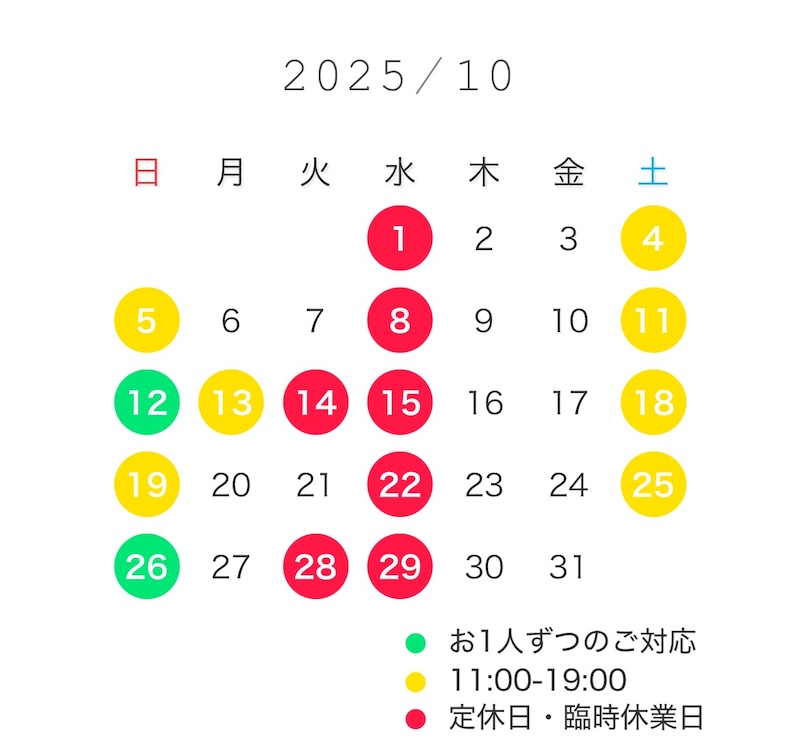 10月に入りまして、営業のスケジュールをアップさせていただきます。