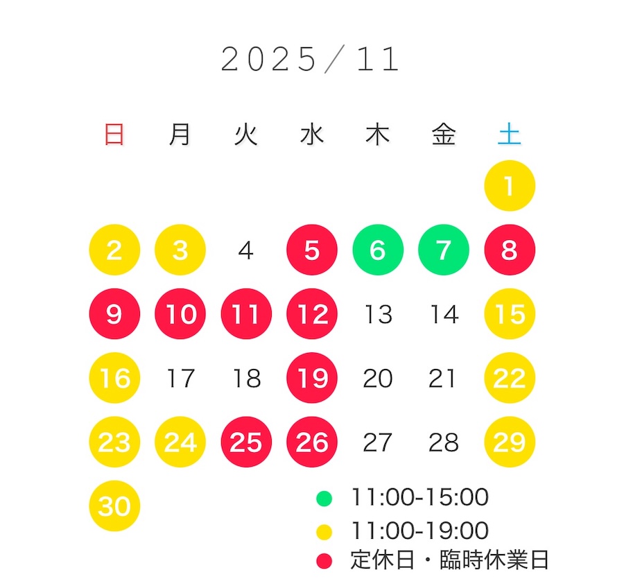11月6日(木)〜11月12日(水)までの営業を以下の通りとさせていただきます。