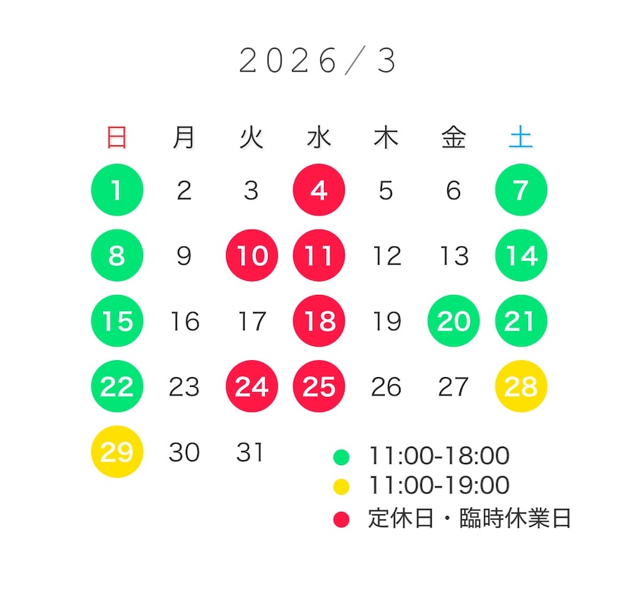 土日祝は11:00〜18:00とさせていただきます。