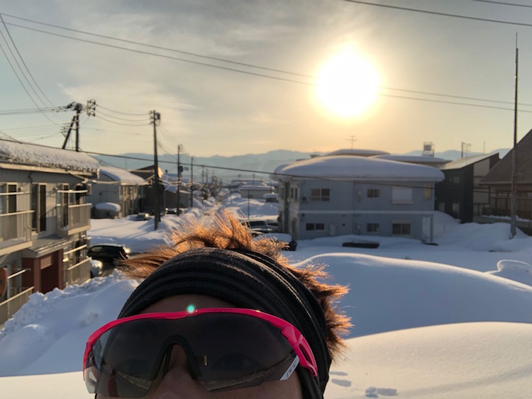 雪下ろしの前に・・・身体がしっかりと動くように、アップで土手をスノーランニング。